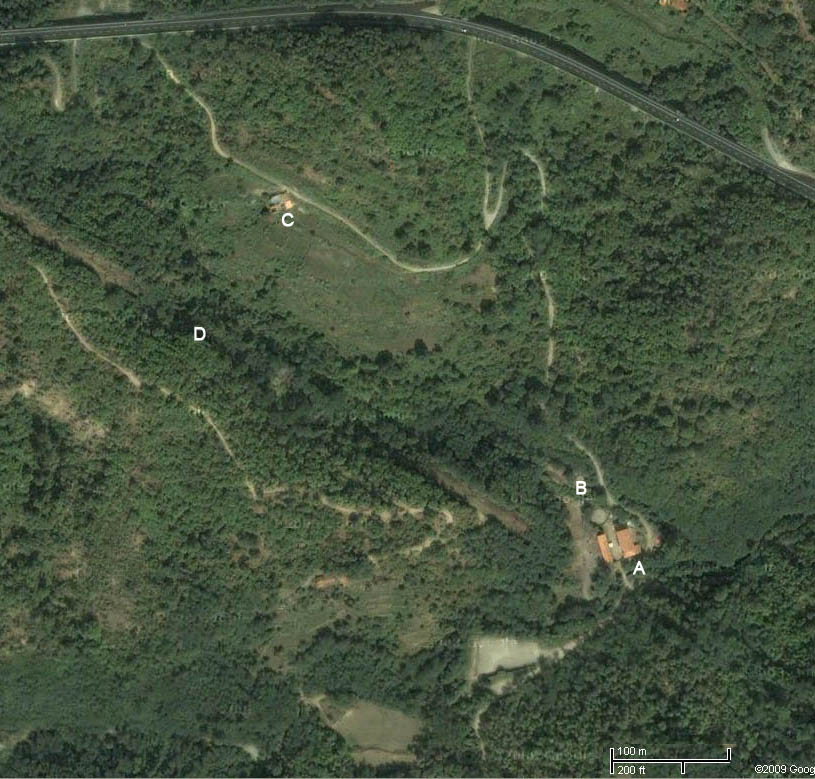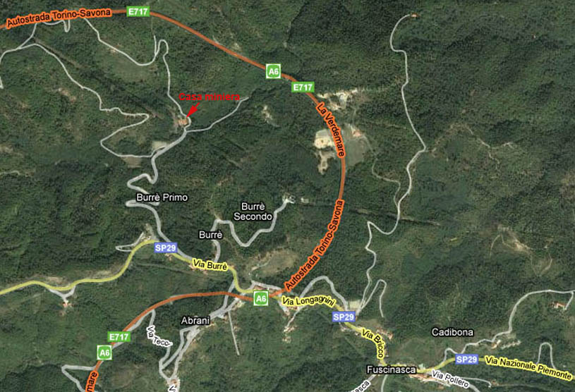Foto da satellite dell'area della miniera di Cadibona: cliccare sulle lettere per accedere